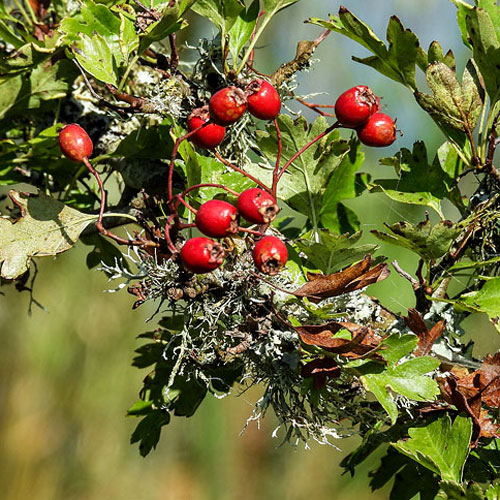 My attention turned the to what I could find along the path. Some Dog Lichen was growing on a small tree. Nearby there was Usnea Lichen growing on Hawthorn branches loaded with berries. Further down the path I found more berries - juicy Brambles. As I snapped a few shots, a lovely Peacock butterfly flew onto the path beside me. There were very many Large Bindweed flowers draped over the bushes along the trail.