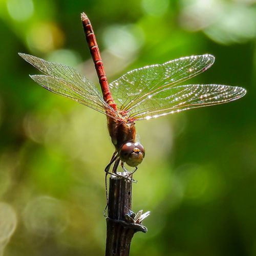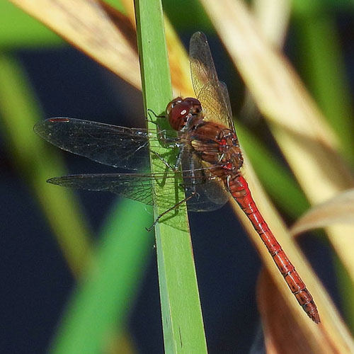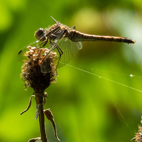 fading flower beds. Beside the trees near the Motherwell entrance to the park I photographed a Speckled Wood butterfly. I walked down to the River Clyde and found a Common Darter dragonfly clinging to an old Hogweed flowerhead.
