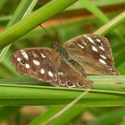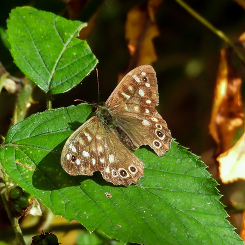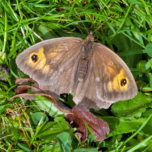 ….. and the Red Admiral, as well as Buff-tailed Bumblebees and metallic green blow-fly, Lucilia caesar . I returned to the car via the other side of the Buckthorns and after photographing a handsome Woodpigeon hiding in the Buckthorns, a sixth butterfly made an appearance, a Meadow Brown ….