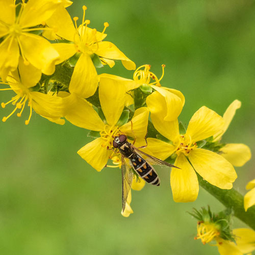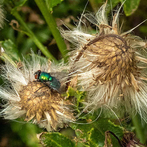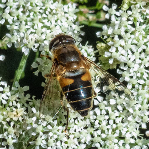 I decided to walk along the trail to try my luck on the way to the boardwalk over to the ruin of the Peel Tower of Castle Semple Loch. I passed a large Hogweed flower that was hosting several insects: a Common Wasp, a Dronefly, probably Eristalis arbustorum, and Greenbottles, probably