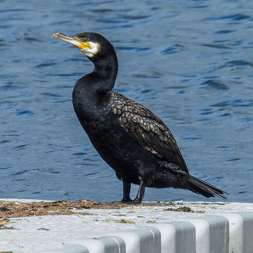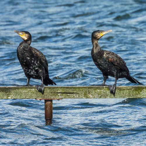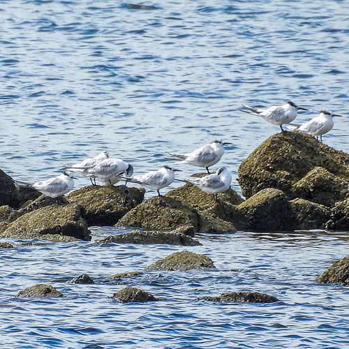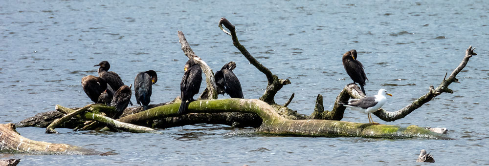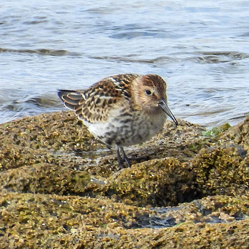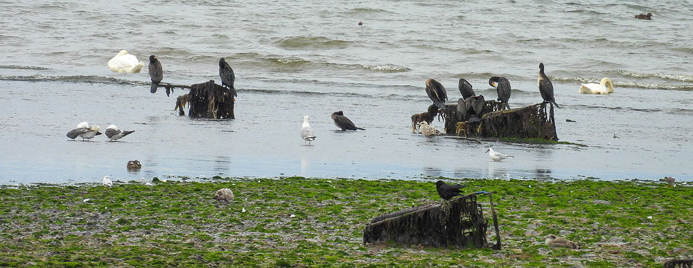 ... followed by another Peacock. It had been a productive half hour. I drove the short distance to the small, sea-facing car park near the harbour, just north of the Ballast Bank. In the short time I was at the North Shore car park, the clouds had parted and the Sun started shining for most of the time I was there. There are usually birds on the rocks, especially when the tide is low. I was pleased to see about a dozen Shags on a rocky islet just offshore. And on an adjacent islet there were Ringed Plovers and Dunlin - small waders waiting on the tide to recede.