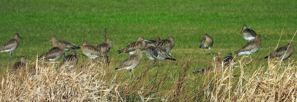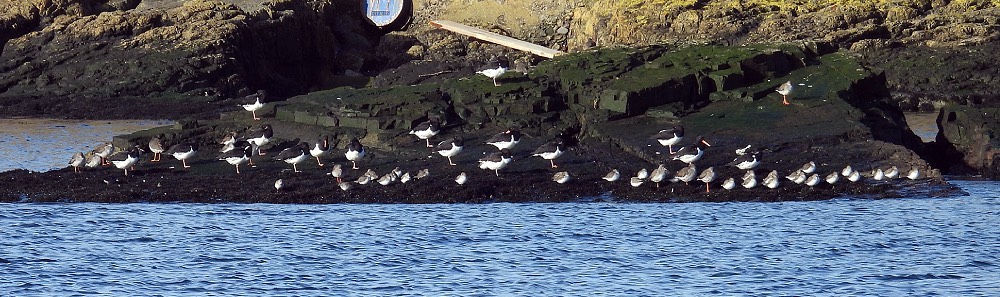 Across the harbour I could see a gathering of waders on and around a line rocks……