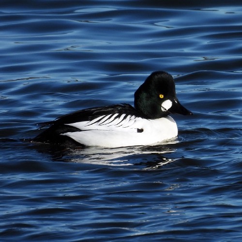 Coots (white head patch and legs). These should not be confused with male Goldeneyes