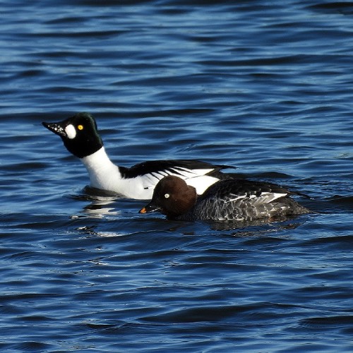 (black and white ducks with with white cheek patches and golden eyes). The females are brown