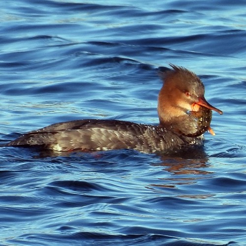 There were two birds diving on the harbour waters: a pair of Red-breasted Mergansers.