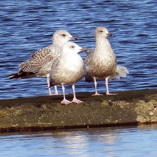 were three species of gulls: Herring Gulls (large with pink legs), Black-headed Gulls (small with red