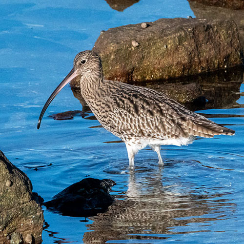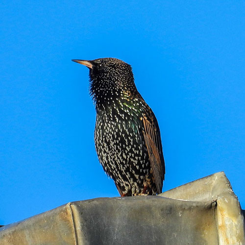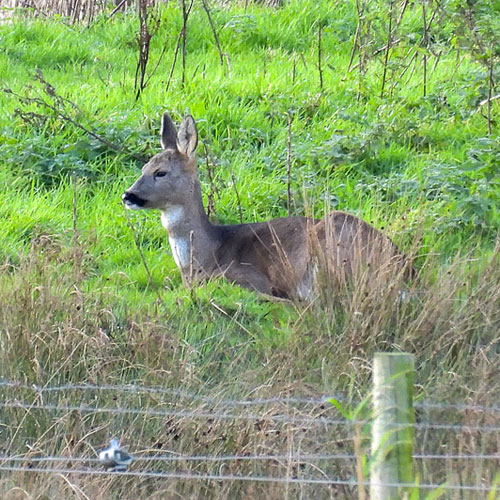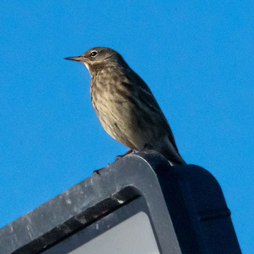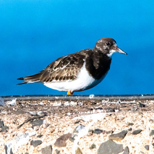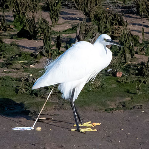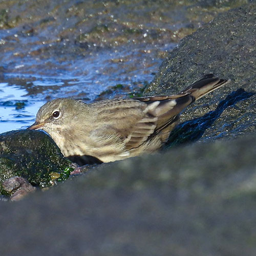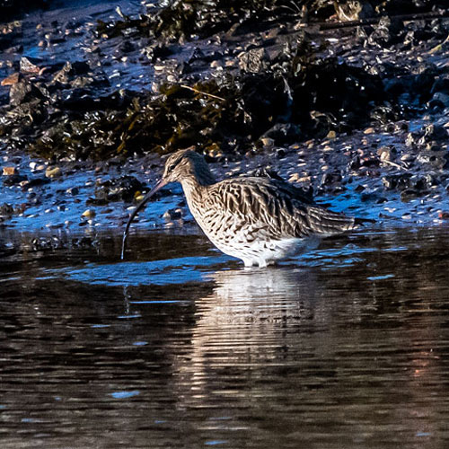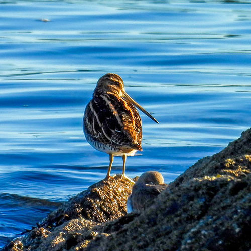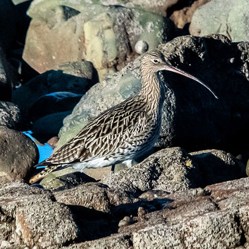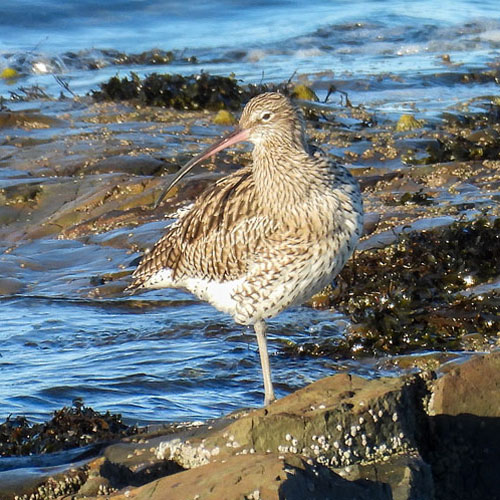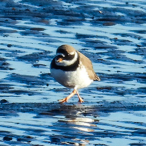 I relocated to The Braes car park and began a walk along the north side of the sea wall. I photographed a singing Starling that was perched on a chimney stack on the row of houses on Windmill Street. I managed closer shots of the Snipe and Ringed Plovers I’d seen from the harbour. I also snapped a snoozing Redshank.