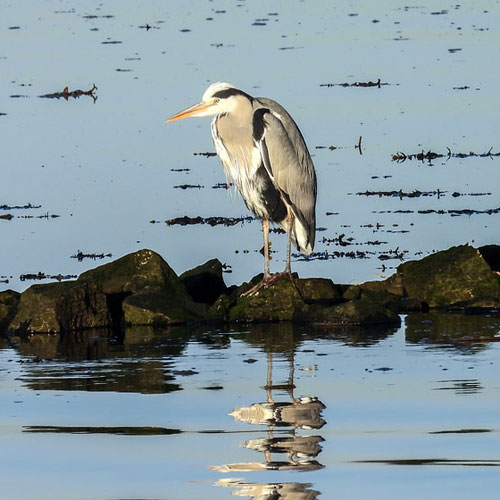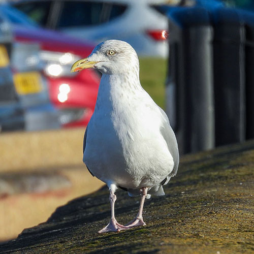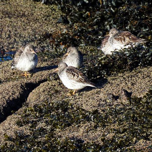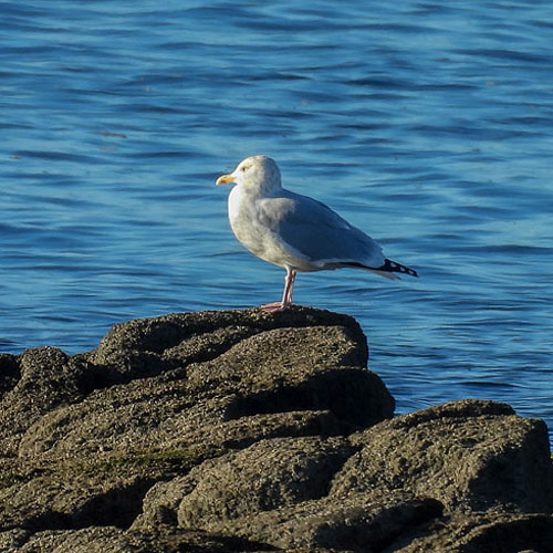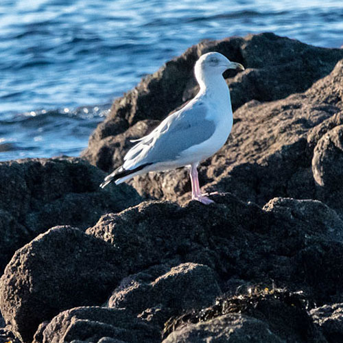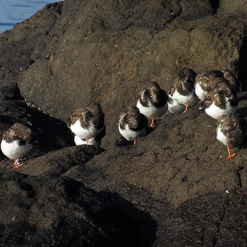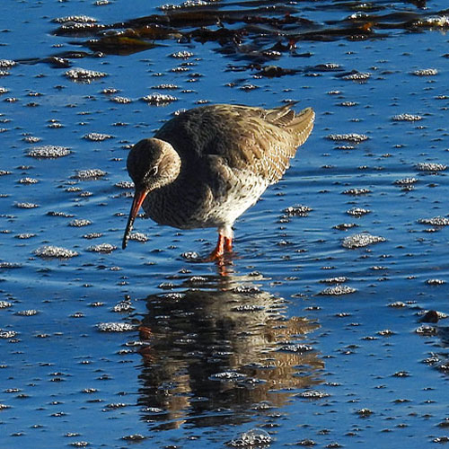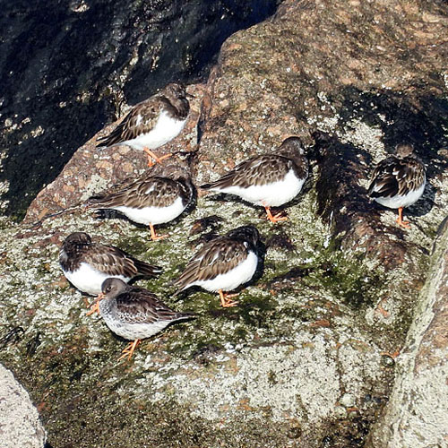 There were Oystercatchers and Purple Sandpipers on the rocks north of the harbour mouth, near “Salcoats Tower”. A young Herring Gull on the sea wall watched me at the tower as I observed a group of six Turnstones snoozing on a sun-licked boulder by the outdoor paddling pool. On further inspection I realised that there are five Turnstones plus a single Purple Sandpiper. I got another couple of shots on my way back to the car: a moody picture of a Redshank foraging in the shallows, and big chip-hungry Herring Gull on the sea wall, looking at me longingly.