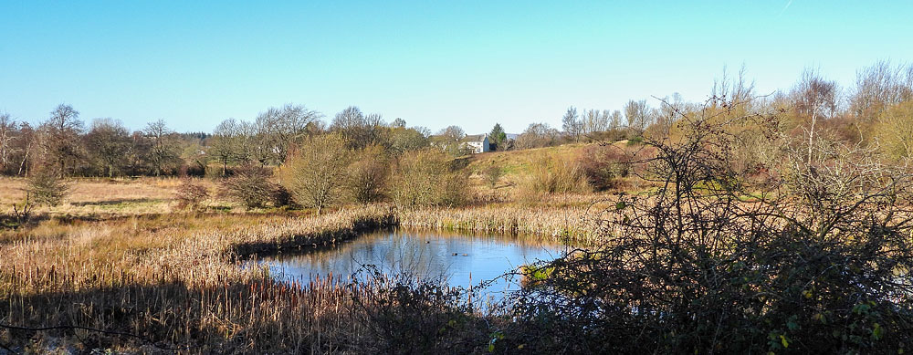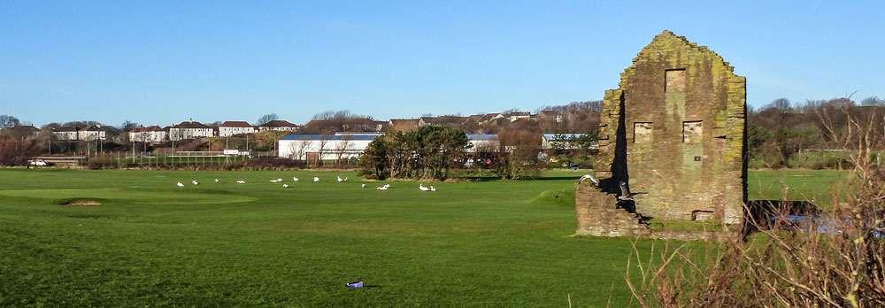 A few minutes along the convenient footpath that runs the length of the course, one finds the Auchenharvie Loch and the rather scenic ruins of a pump house. Note the fifteen grazing Mute Swans.