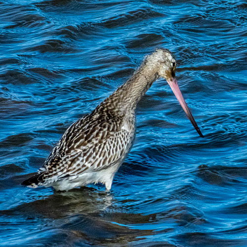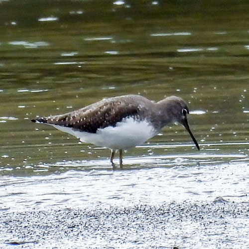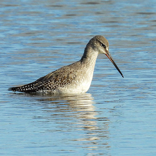 a Spoonbill that was snoozing behind the most distant scrape. Apparently it hadn’t raised its head for a half hour - and even then, it resumed its slumber after a few seconds. I watched it and waited, and after about 10 minutes it briefly raised its head and I had my shot. Next, I was photographing a Curlew when I noticed the Marsh Sandpiper I’d seen at the Morrison’s Haven Scrape a few weeks ago. It was at the far left end of the left-most hide. My final picture was of a Spotted Redshank that was wading close to the right of the same hide.