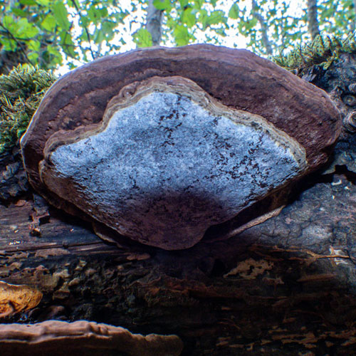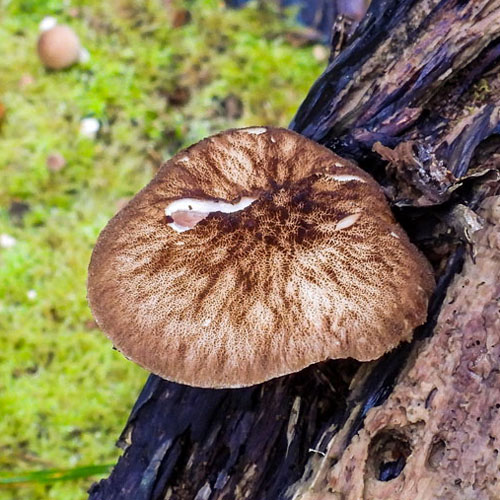 White Walk to the hides. I spotted a wee clump of Shaggy Inkcap fungi by the fence and when I looked beyond the fence there was 10 sq m area of starshaped Collared Earthstar fungi. Halfway down the brae there was a mature Artist’s Bracket growing on an old tree stump at the edge of the path.