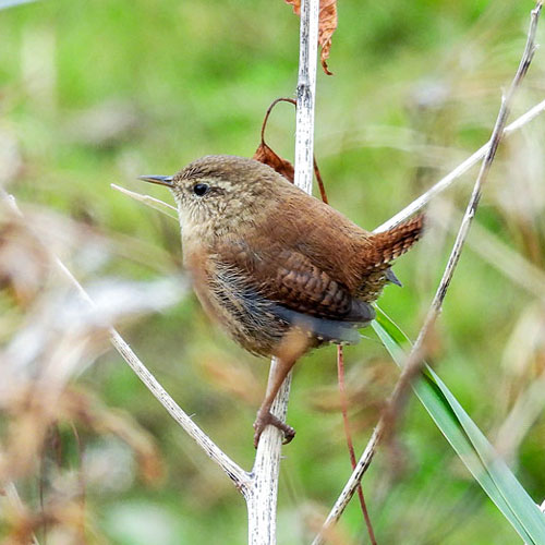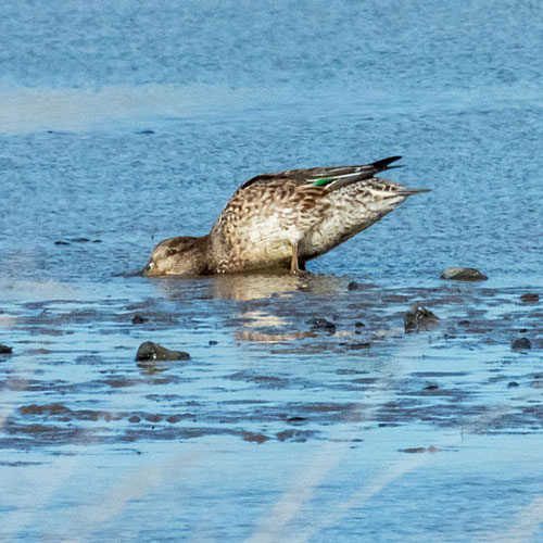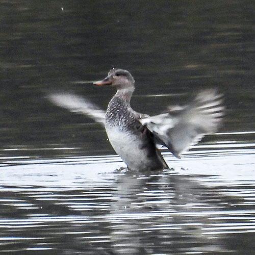 …. but, thankfully, there were birds, mainly Black-headed Gulls and Mallards. I did manage a wee Wren when it started singing on the Teasels in front of the hide. The scrapes were flooded, so I scanned the areas beyond there and found Gadwalla, and caught a juvenile flapping it's wings.
