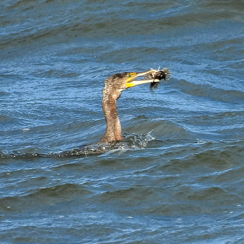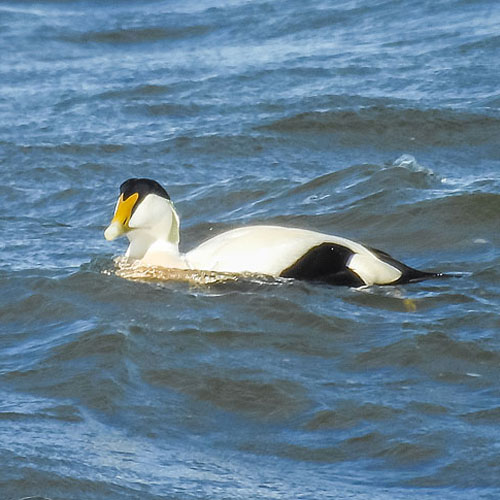 Unfortunately there weren’t many birds on view - only a couple of Teal and Redshanks. I made my way to the sea wall and proceeded to walk back west towards the Old Scrapes. On the way I photographed a drake Eider and a Cormorant that had caught a fish.