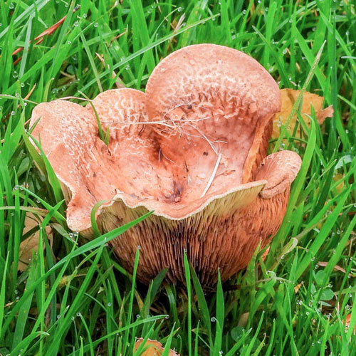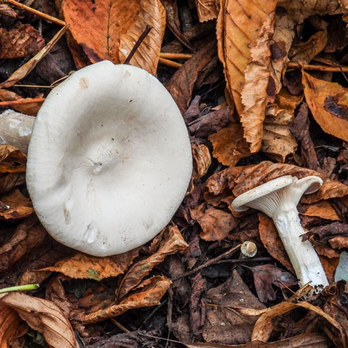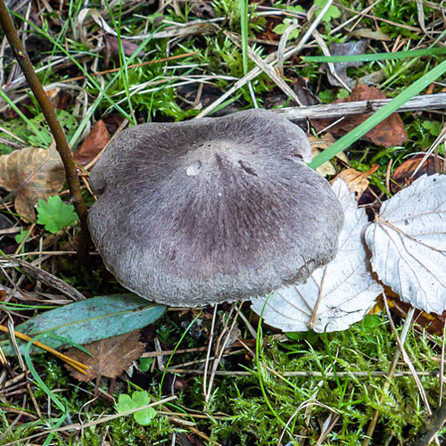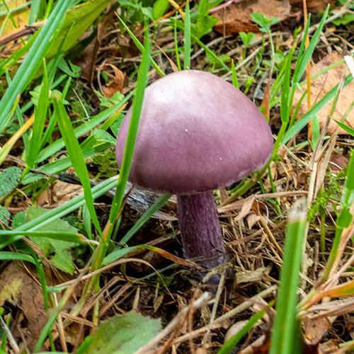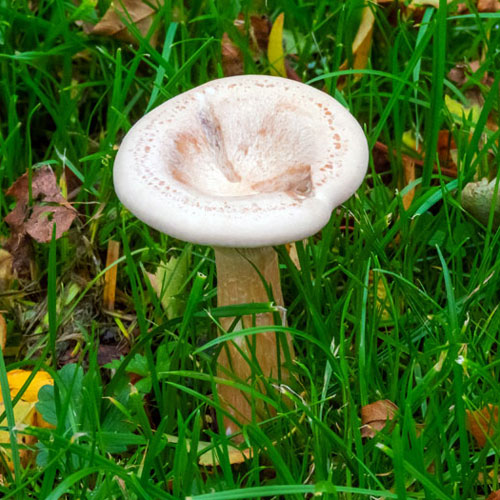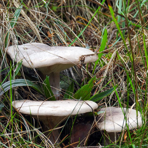 grass. The first of these was Common Funnel , described in texts as “gregarious” because it is usually found in groups. The other mushroom was solitary, and purple, an Amethyst Deceiver. It's called a " deceiver " because it loses it's vibrant violet colour as it ages making it more difficult to identify.