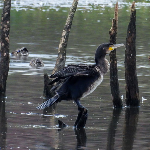 I could see even more Teal: drakes, females and one eclipse male. A Carrion Crow appeared, triumphantly displaying an apple it had found. After that a juvenile Cormorant flew in and landed opposite the hide. It called a few times before starting to preen it feathers. Meanwhile a Curlew