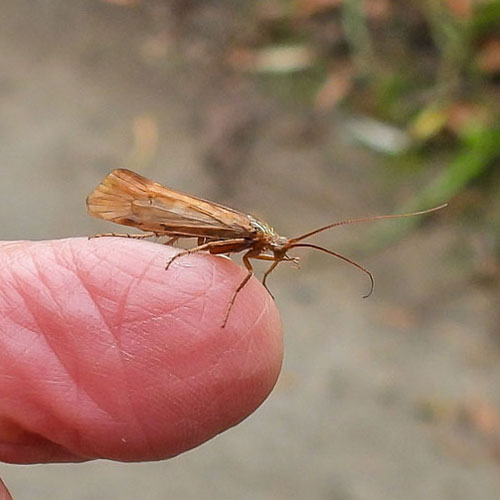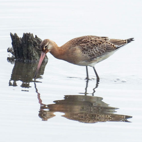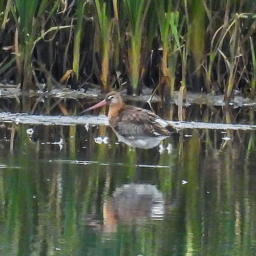 I decided to try to see or hear the Cetti’s Warbler. En route to the “breach” (I.e. the site of the now demolished Phoenix Hide), I spotted a Redwing on top of a tree bordering the fields. As I paused to view the river, a Caddis Fly walked onto my boot and was about to crawl up my leg before I offered it my warm finger - onto which it settled. I managed a quick shot before returning it safely to the grassy verge. And just before the breach, at a sluice gate, I found yet more fungi - Pale Brittlestem and Shaggy Scalycap. At the breach I sat for about 30 minutes listening and watching for the Cetti’s Warbler - in vain, sadly. To be fair, I read in social media that others tried throughout the day, each with little success. However since Friday, the bird has been heard and seen and photographed. My patience was partially rewarded when a Black-tailed Godwit came into view quite close to the breach. A few Common Snipe then flew in and a couple of them started to wade close to the godwit.