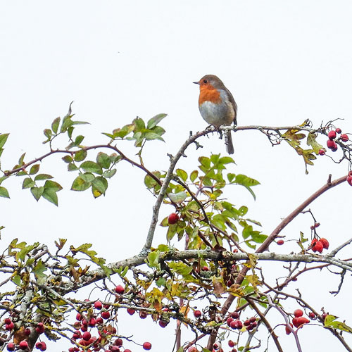 On my way back up the slope to the car park I passed 3 more species of fungi - Trooping Funnel , Conifer Tuft and Oakbug Milkcap . My penultimate photo was of a distant, lone Robin singing atop a Hawthorn bush.
