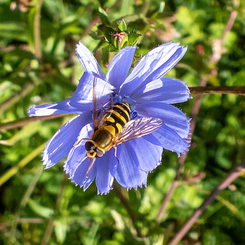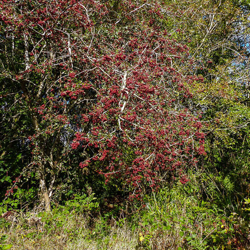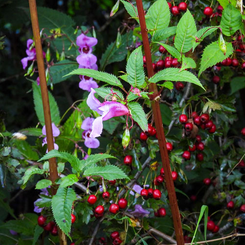 way around the damaged pathway and continued into the reserve. My first sighting there was of a Cormorant on the river. I was impressed by the profusion of Haw berries on the Hawthorn bushes - a result of the very mild summer. A Common Snowberry bush was hosting hungry hoverflies. The Snowberry is considered to be an invasive species, as is the beautiful, but destructive Himalayan Balsam, which was growing profusely all along banks of the Clyde.