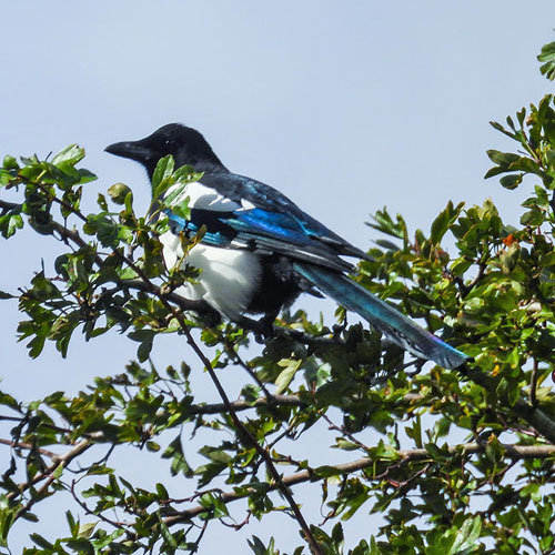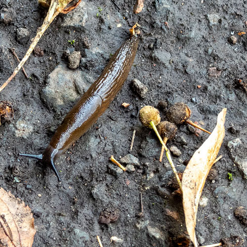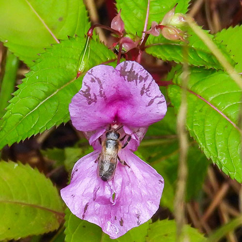 As I was photographing a bee (unidentified) that was feeding on a Himalayan Balsam flower, a Magpie descended onto the path and pecked up something which it then carried up into the tree branches. Next, I managed to photograph a Black Slug (brown form) that was labouring its