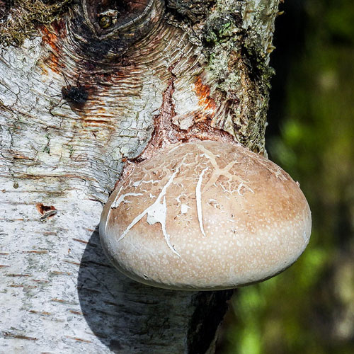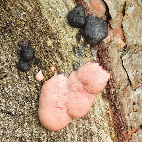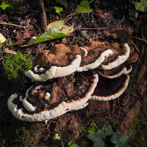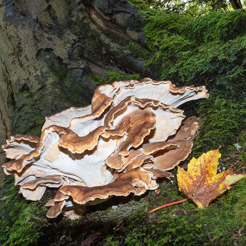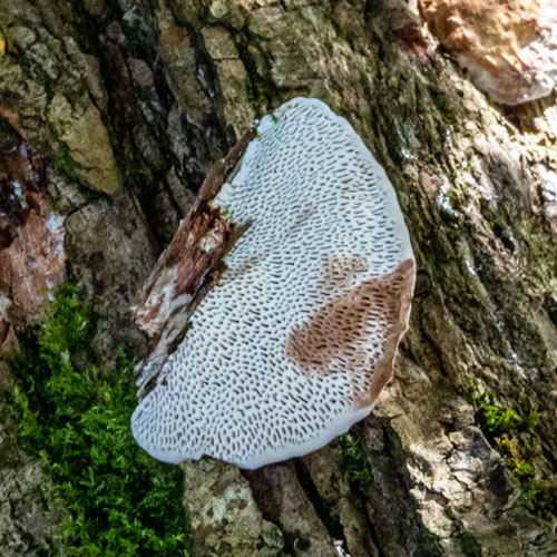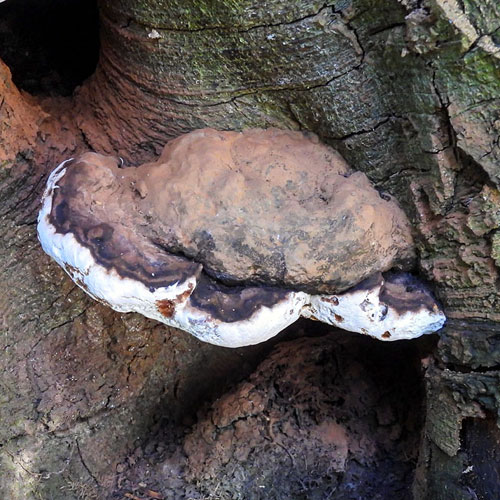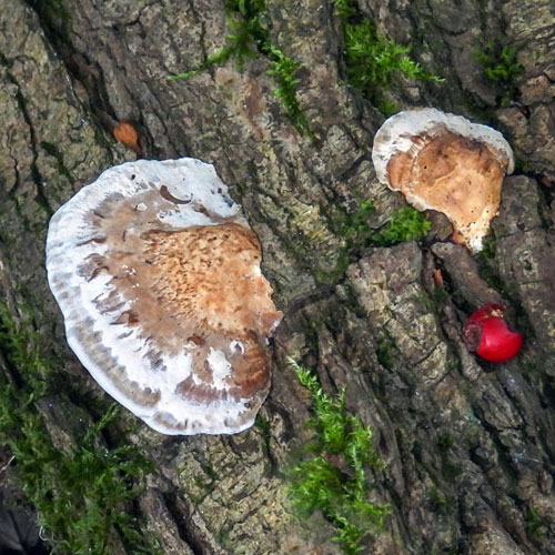 These orange fungi were growing just off the path on a decaying tree stump. I followed that with a shot of Artist's Bracket growing low on a thick tree trunk. My next two finds were special in that they were both newbies: Black Bulgar and Giant Polypore.