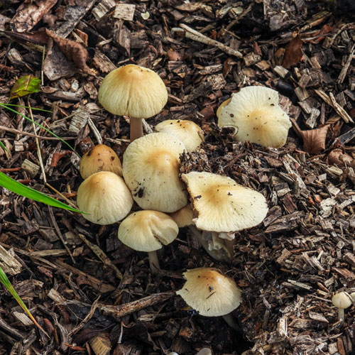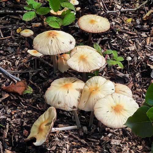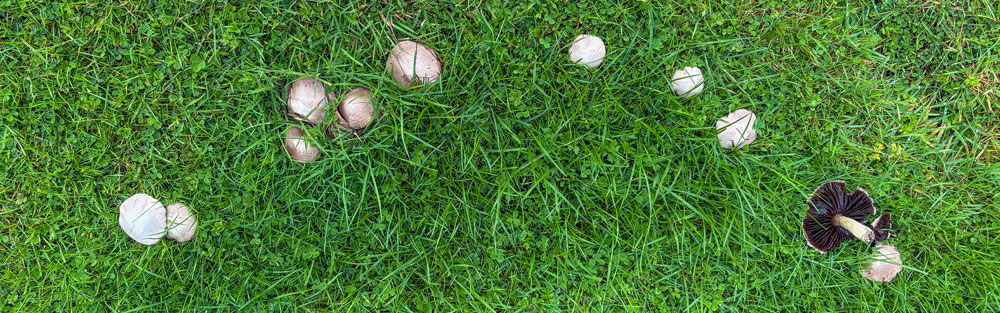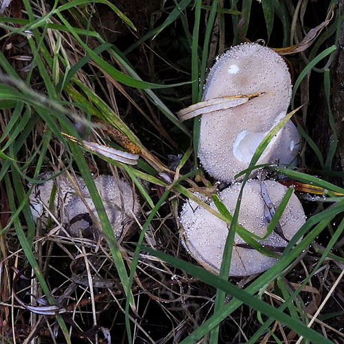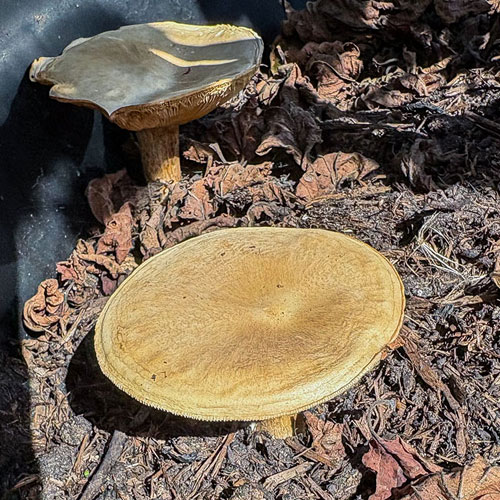 In the garden outside the derelict house at the football pitches there was a Brown Birch Bolete. Suede Boletes were growing below conifers near the far side of the footbridge I’d crossed earlier. A third bolete was growing below Larch trees at the park perimeter opposite the road junction that leads to the Watersports Centre. They were, as you might guess, Larch Boletes. A few Red-edged Brittlestem fungi were growing in the woods behind M&Ds. My final find resulted from the work done near the main Motherwell park entrance, by the park workers who were cutting down diseased trees, keeping park-users safe. There were pretty white fungi, Porcelain Fungus growing on the trunk of one of the felled trees.