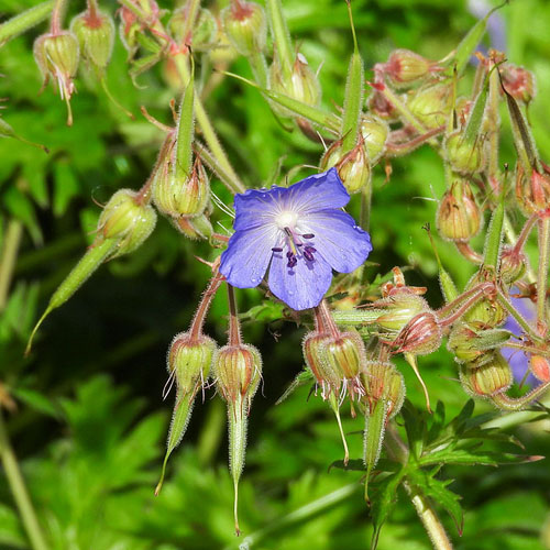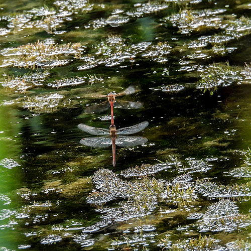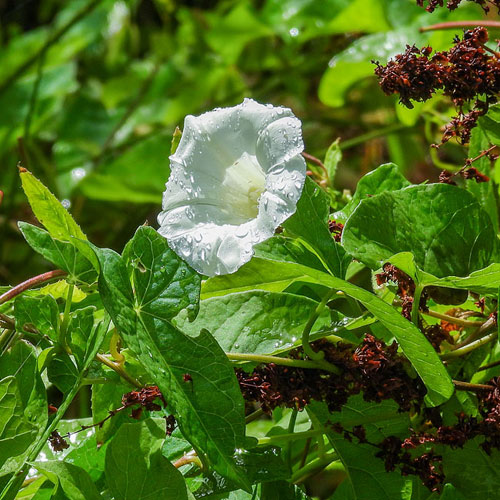The chick had difficulty swallowing the fish and the parent bird had several attempts at presenting the fish to the chick before it managed to get it down. Next, as I snapped a Large Bindweed then a Meadow Cranesbill, I could feel raindrops starting to fall. I walked at pace for cover beneath the tall trees just before the boardwalk, stopping momentarily to photograph rain pelting a Moorhen feeding.