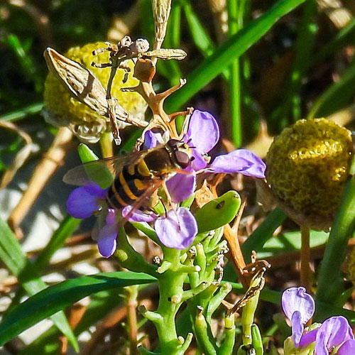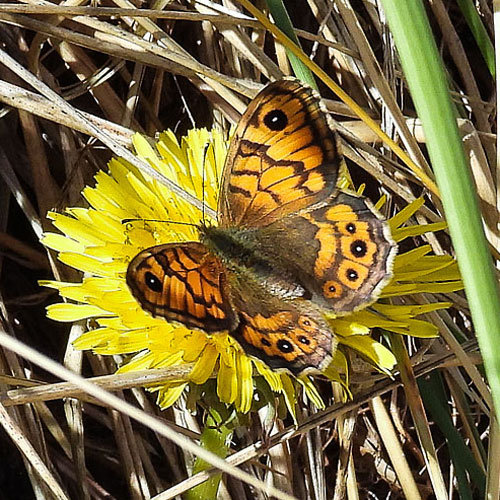 Sea Rocket was still in flower with some hoverflies, like Syrphus ribesii, feeding on them. At the far end of the small beach, a beautiful Wall butterfly fluttered onto a dandelion flower. Although the sea was far from the sandy beach, I did spot some Oystercatchers and Redshanks
