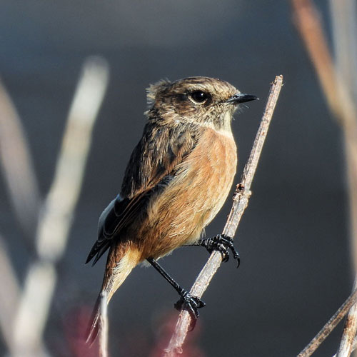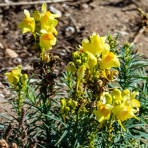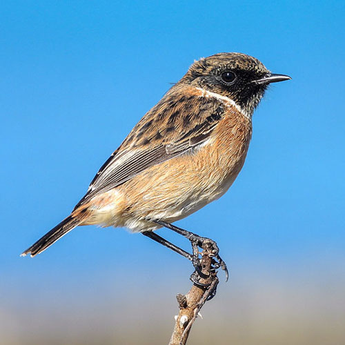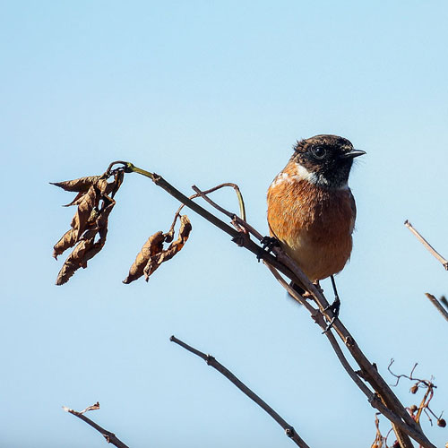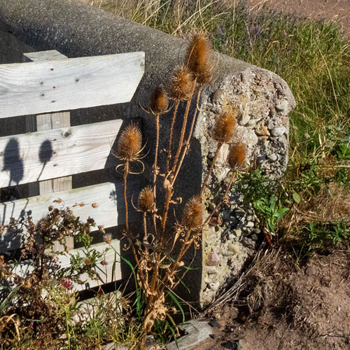 As I admired the above panorama, I could hear the familiar calls of a Stonechat. I located it easily since those birds usually stand high on bushes or grasses. I walked around the coast and came upon a patch of Common Toadflax growing in an eroded section of the coastline. At a large bush I was surprised to see a pair of Stonechats at a much closer range (6m) than before. However, there wasn’t a single sea bird in sight so I decided to return to the car and head for Barns Ness. I did get another couple of flower sightings: Teasel and Red Valerian at the Bungalow by the beach.