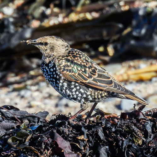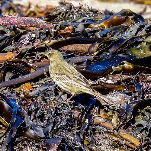 Next my attentions turned to a seaweed pile washed up on the shore, which was attracting Rock Pipits and Starlings. I also spotted a Meadow Pipit. They were hunting invertebrates that were emerging from the rotting seaweed. Another Wall butterfly flew in and landed beside me on the