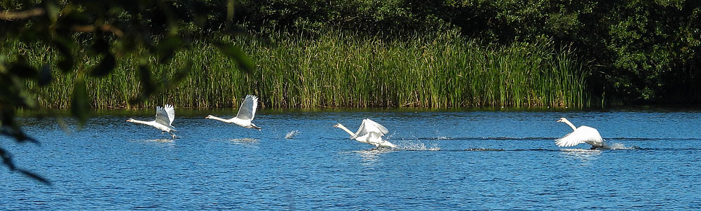 As I moved along the path on the east side of the loch I spied a quartet of Mute Swans flying in a line down the loch.