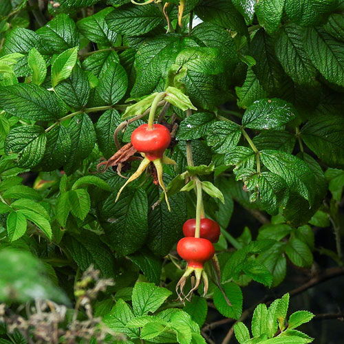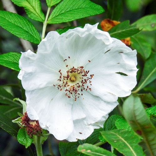 I next made my way along the tree-lined eastern side of the loch where the flowers and hips of a lovely white Japanese Rose. In a gap between the trees, a single Moorhen and eight Mute Swans were gathered, obviously finishing off some bread chucked in by another walker.
