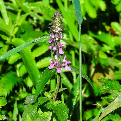 The rain passed after about 10 minutes and I was soon crossing the boardwalk where I watched a Little Grebe diving for little fishes. I rounded the head of the loch and nearly managed a nice shot of a Willow Warbler as it moved about a Alder Tree. The tree was in fruit. Note the two types of flowering parts: long (female) and conical (male). Near the tree, pretty Marsh Woundwort flowers be-decked the long grasses.
