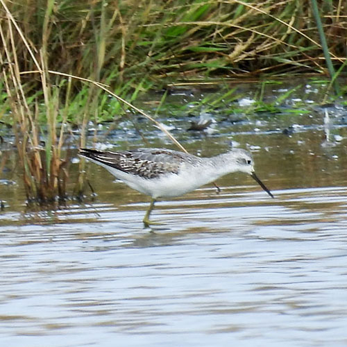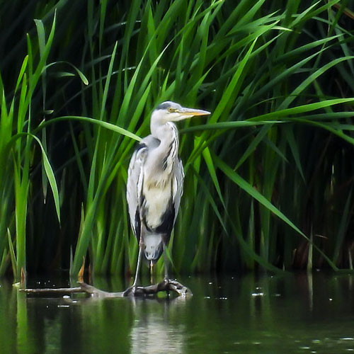 shallows and a lone Grey Heron made an appearance by the far reeds. My