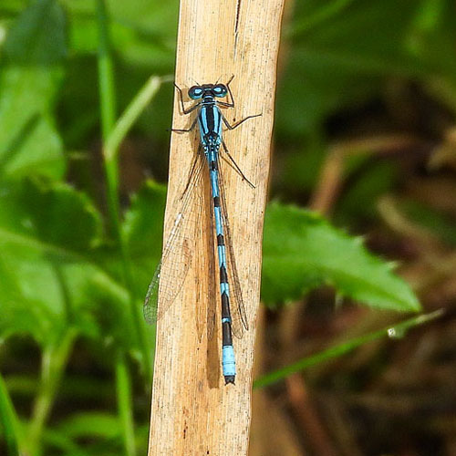 A female Scaup paddled past the grebes and as I photographed it, an Azure Damselfly fluttered past me and landed on a Bulrush (or