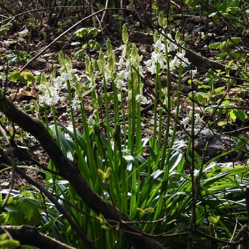 car park: a white variety of Spanish Bluebell growing wild among the shrubbery, a
