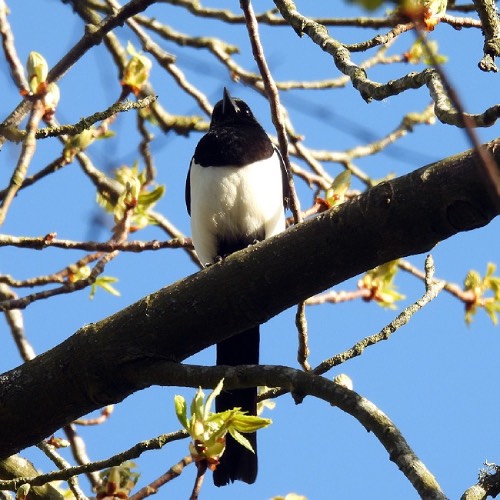 a Magpie. Below it there were no fewer that six small birds hopping between the lower twigs and