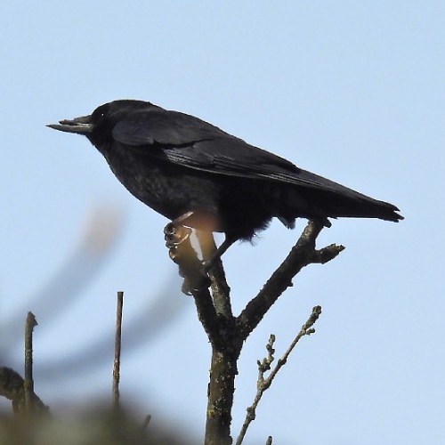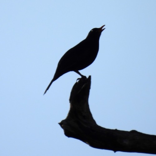 a back-lit, silhouetted Blackbird warbling high in a distant tree.