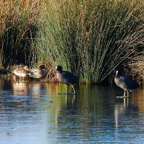 Coots, Mallards and Wigeons were standing on the ice, while Gadwalls and Teal found a