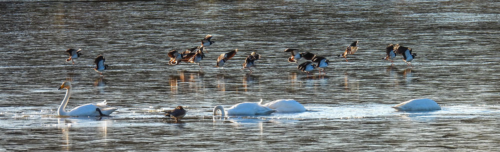 penetrate the ice there. Lapwings flew in as I photographed the swans.