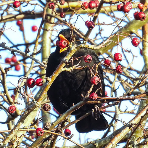 were a very sociable Robin, a Blackbird and some Redwings munching haw berries.