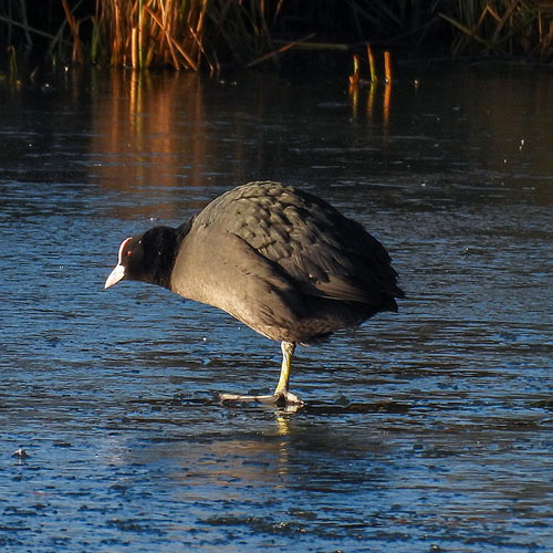 small area of ice-free water. A couple of Moorhens were foraging in the reeds near the hide.