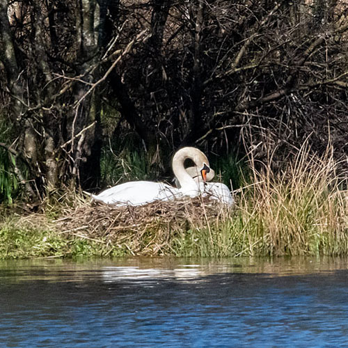 Swans setting up a nest on the opposite bank and, by the near bank, an