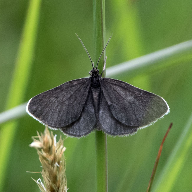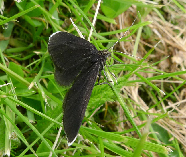 Almost completely black with the apex and apical fringe of the forewing, white.