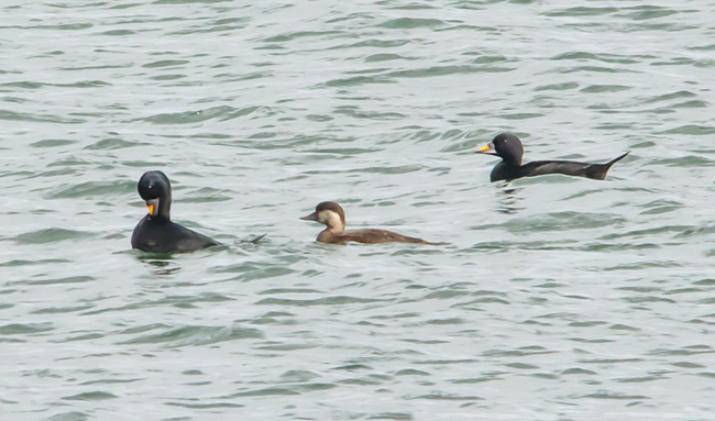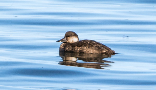 coloration around the nostrils. The female is a brown bird with pale cheeks.