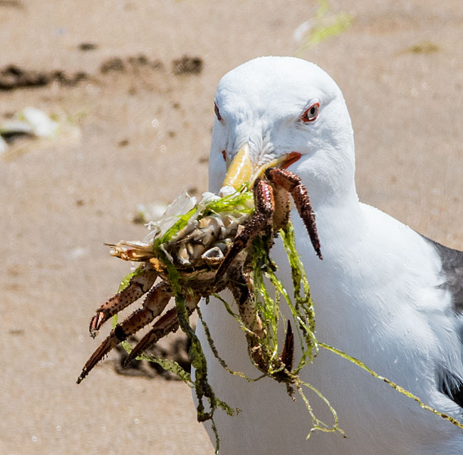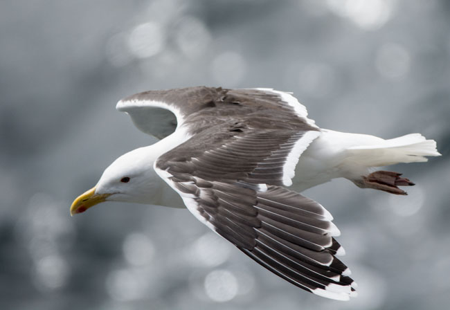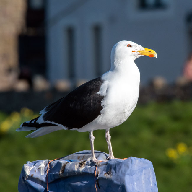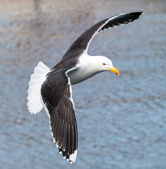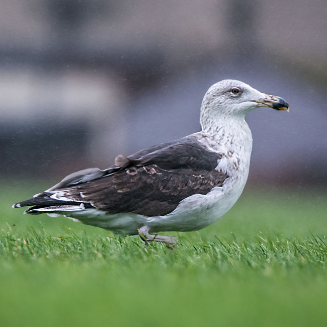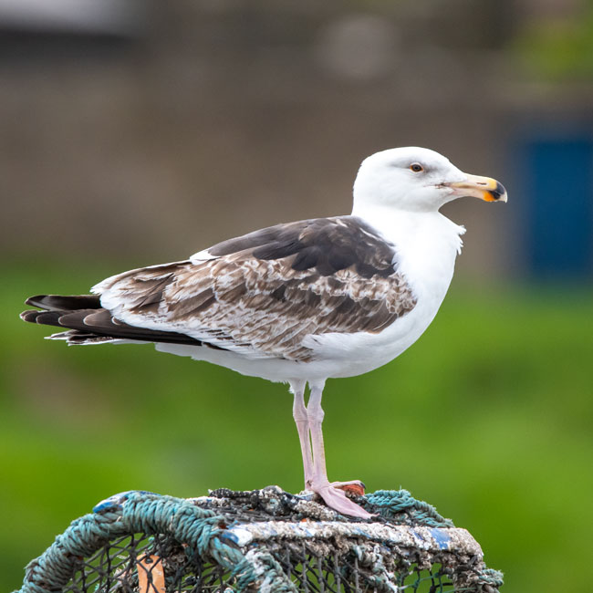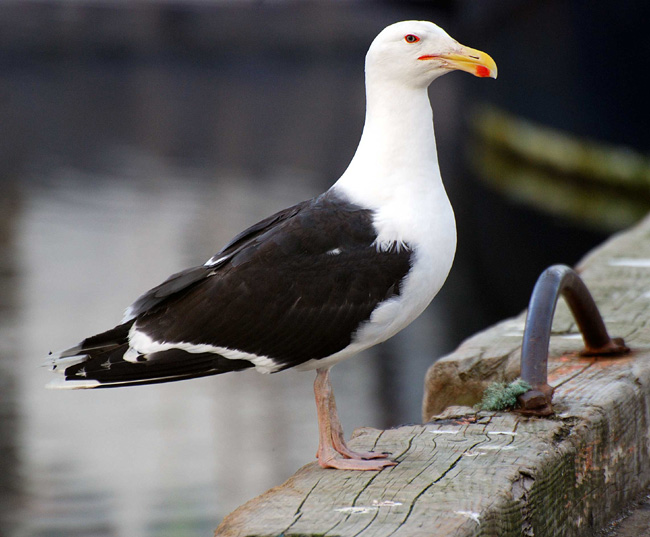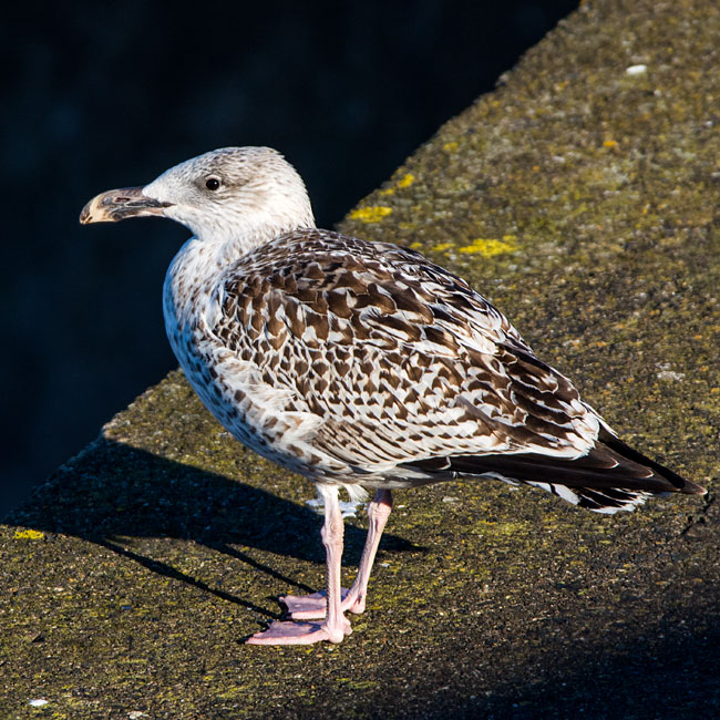 contrasting white "mirrors" at the wing tips. The legs are pinkish, and