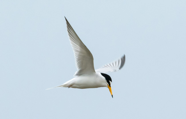 White forehead in breeding plumage. It's thin sharp bill is yellow with