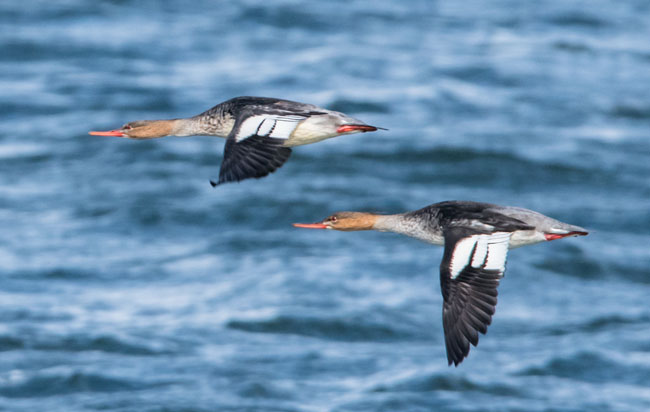 The male has a dark head with a green sheen, a white neck with a rusty