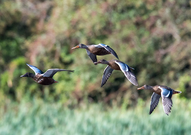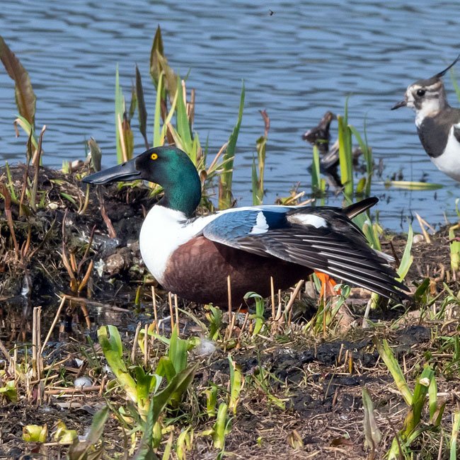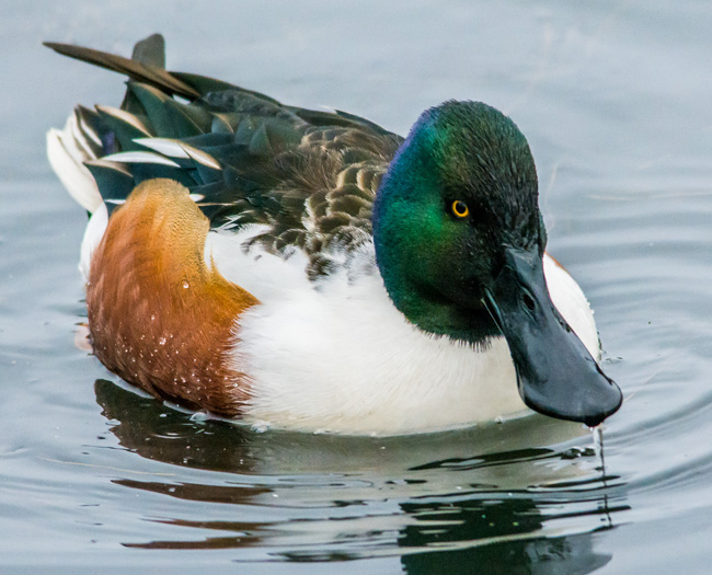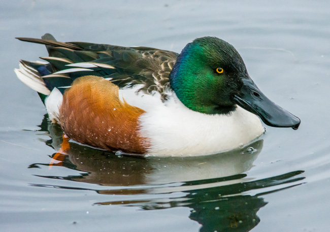 long broad bill easily identifies them. In non-breeding plumage, the drake looks more like the